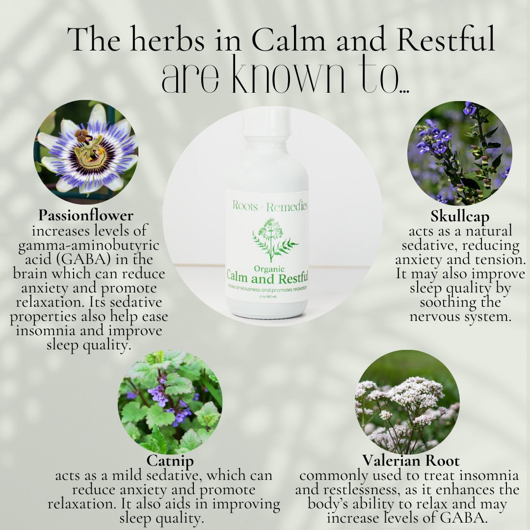 Struggling with sleepless nights and constant restlessness? It’s time to reclaim your peace with Roots and Remedies Calm and Restful herbal extract. When life’s demands leave your mind racing and your body restless, finding relaxation is essential. Our carefully crafted blend of natural herbs—Passionflower, Skullcap, Catnip, and Valerian Root—helps you unwind, calm your mind, and get the restorative sleep you deserve.