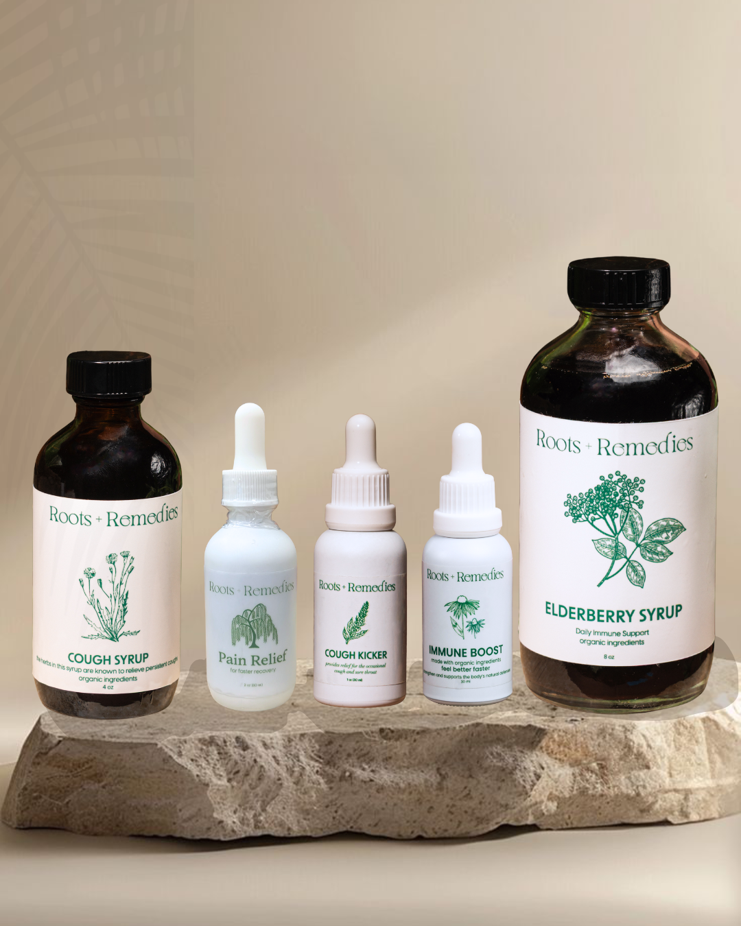 Family Size: 4oz immune boost and cough kicker tinctures, 2oz pain relief tincture, 4oz cough syrup, 16oz elderberry syrup