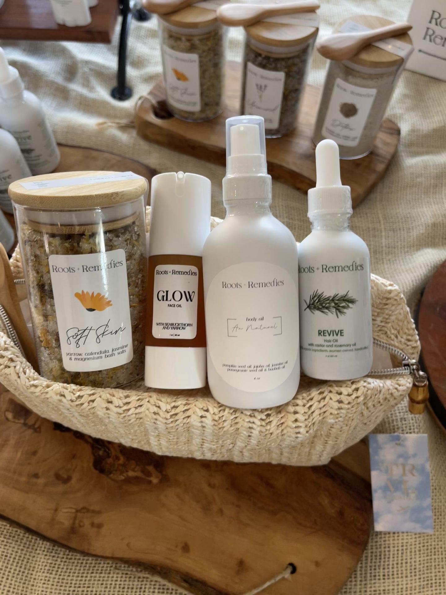 Introducing Roots and Remedies' Self Care Gift Set, a curated collection crafted to elevate your self-care routine. Choose from our exquisite bath salts in Unwind, Soft Skin, or Detox variants, each designed to cater to your unique needs. Pamper your skin with our Glow Face Oil, indulge in the opulence of our Luxurious Body Oil, and promote hair health with our Revive Hair Growth and Health Oil. Elevate your well-being with this thoughtfully designed self-care ensemble from Roots and Remedies.