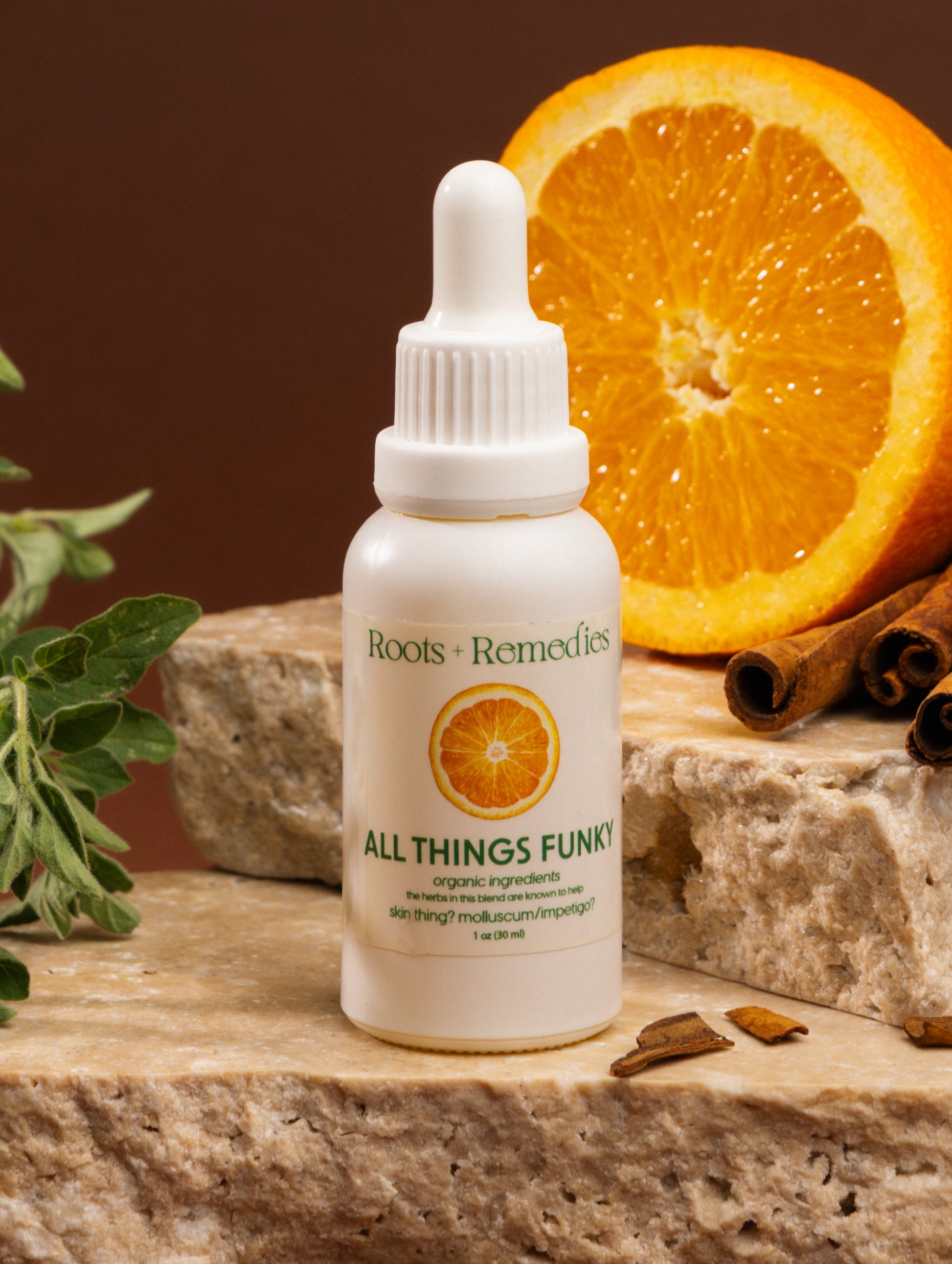 Looking for a natural remedy for warts, molluscum, impetigo, or fungal infections? All Things Funky from Roots and Remedies is here to help. This potent blend of natural oils is designed to target and relieve tough skin issues, providing fast, effective relief with ingredients you can trust.